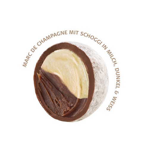 Zarte Truffes für doppelten Genuss: Aussen feinste Schweizer Milchschokolade, innen ein cremig schmelzendes Zweierlei aus weisser und dunkler Schokolade, verfeinert mit edlem Marc de Champagne. Einfach unvergesslich.