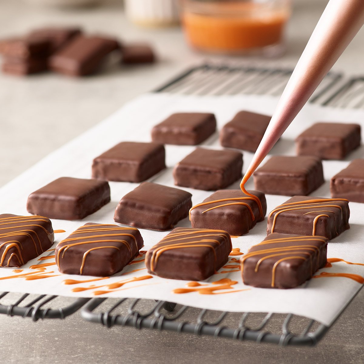 These chocolate wafers stand out for their generous amount of soft gianduja and orange cream and a crisp biscuit. They are also coated in the finest dark chocolate and feature beautiful decoration. An unforgettable pleasure experience. Only while stocks last.