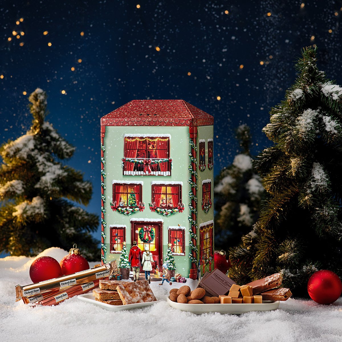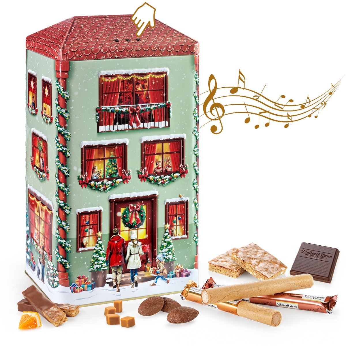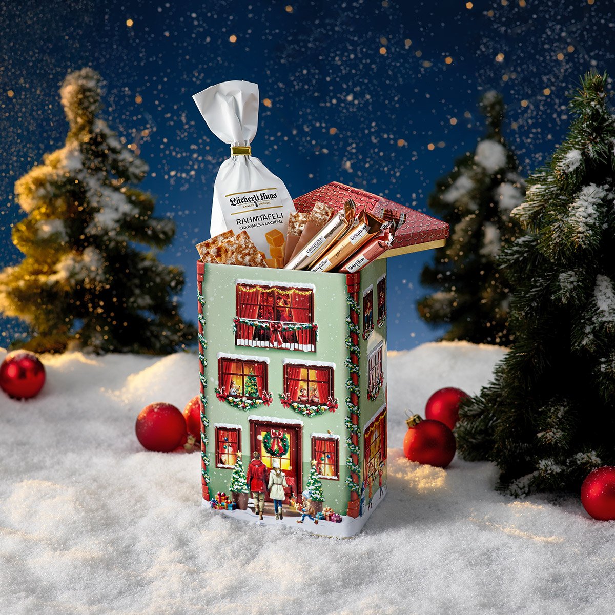 Inside the house is a rich assortment of the finest specialities: Basler Läckerli Original, Basler Läckerli au chocolat à l’orange, cream caramels, chocolate-coated almonds, three varieties of Flûtes de Bâle and Chocolat Grand Cru Madagaskar 64%. A creative work of art that will activate all your sense. The music is operated with two replaceable button batteries.