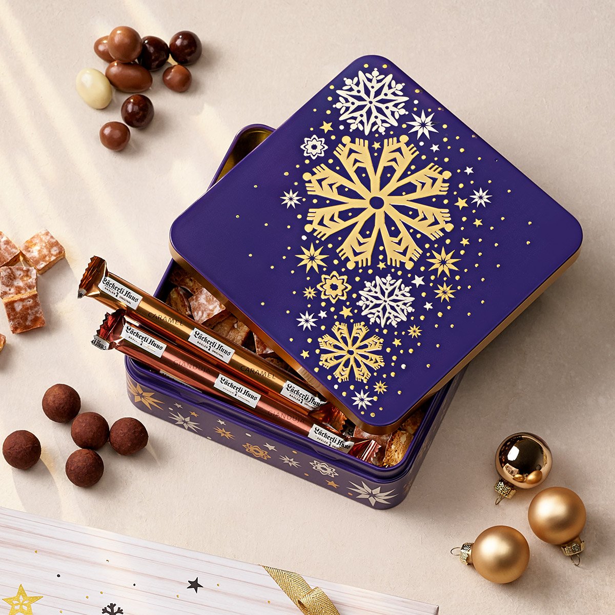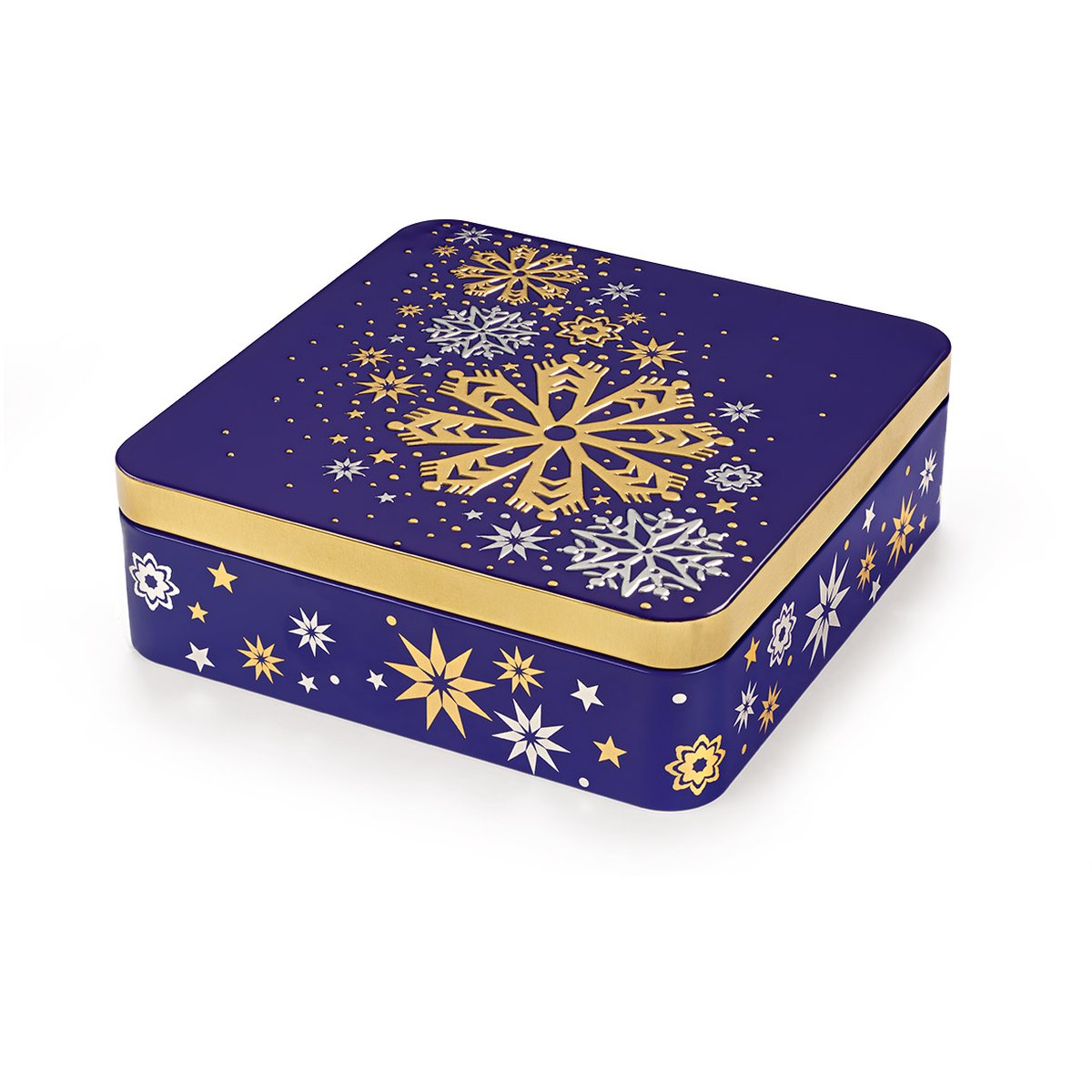 Gold and silver stars and delicate frost flowers on a dark violet backdrop make this tin a real eyecatcher under the Christmas tree. The embossed lid forms an exquisite contrast to the smooth sides. Inside is a magical assortment of our most popular specialities with Perles de Bâle chocolat noir, Flûtes de Bâle in three varieties and Basler Läckerli Piccolo.